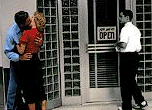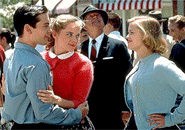 The rest of the movie is the story of how these two characters – transported magically from the future as well as from the real world as opposed to a made-up TV world – introduce change into the town and thereby color. Mary Sue (formerly Jennifer) does it consciously. Rebelling against her brother’s admonishments to follow the script, she goes on a date with someone she is not supposed to (according to the sitcom script) and then – horror of horrors for a 1950s world – engages in sex with him at the local "lover’s lane" (where the farthest that anyone goes, according to "script," is holding hands). We find later that her date describes this unheard of experience to his classmates, and, like ripples emanating from a pebble dropped in a pond, her action results in a number of the school youth engaging in sex and thereby becoming, to everyone’s amazement, colorized!