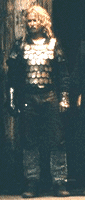 Strangely enough, it is the foreigner Ibn Fadlan who comes closest to being armored as an authentic Viking, wearing a mail hauberk. The only other halfway authentic armor in the film is the scale or lamellar armor worn by Herger the Joyous. Lamellar scale was worn by the Rus, and may have been the armor used by the Byzantine Emperor's Rus who served in the Varangian Guard.