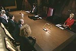 assembled in the boardroom, this time in their business best. Trump asked